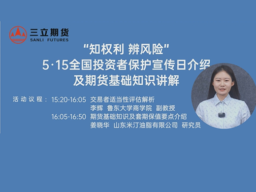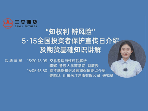 2025年5月19日15时20分,在郑州商品交易所的支持下,山西三立期货举办了“‘知权利辨风险’5·15全国投资者保护宣传日介绍及期货基础知识讲解”的线上投教活动。会议围绕“交易者适当性评估解析”以及“期货基...