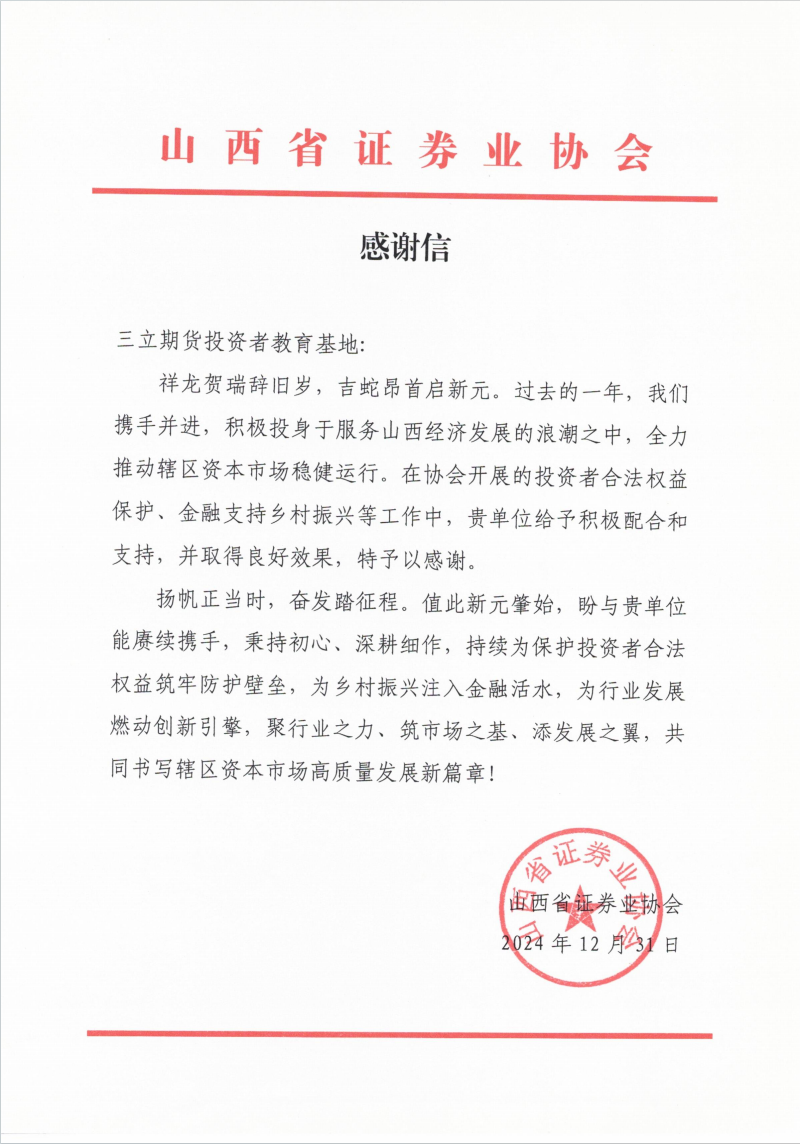 近日,三立期货投资者教育基地(简称“投教基地”)收到了来自山西省证券业协会的一封正式感谢信,信中对三立期货投教基地在投资者合法权益保护、金融支持乡村振兴等工作中的积极配合和支持给予了高度评价。这一荣誉不仅是对三立期货投教基地长期致力于投资者教育工作的肯定,也是对我们在推动行业文化建设、营造良好市场环境方面努力的认可。