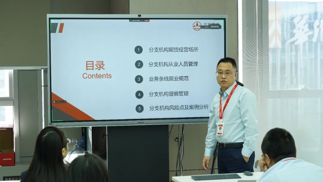 培训过程中,培训讲师围绕分支机构全生命周期合规管理进行了深入剖析。他从期货经营场所的相关法律法规入手,详细阐述了分支机构设立、运营、变更及注销等各个环节的合规管理要求。同时,结合相关规定与三立期货的实际情况,重点讲解了期货从业人员管理、业务条线展业规范、留痕管理等关键环节的注意事项和实施策略。